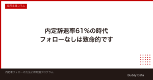 本記事では、内定辞退の最新データと原因分析から、時期別のフォロー手順、効果が出ている施策10選、新卒・中途別のアプローチ、内定者が「嬉しかった」と感じるフォロー事例、ツール選定、外部委託の活用法までを整理しています。株式会社Buddy Dataの採用支援・コンサルティングの知見をもとに構成しており、読み終えるころには自社に合ったフォロープログラムの骨格が見えてくるはずです。